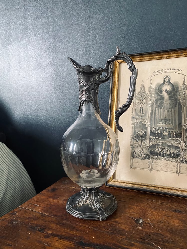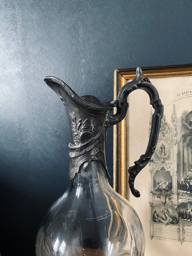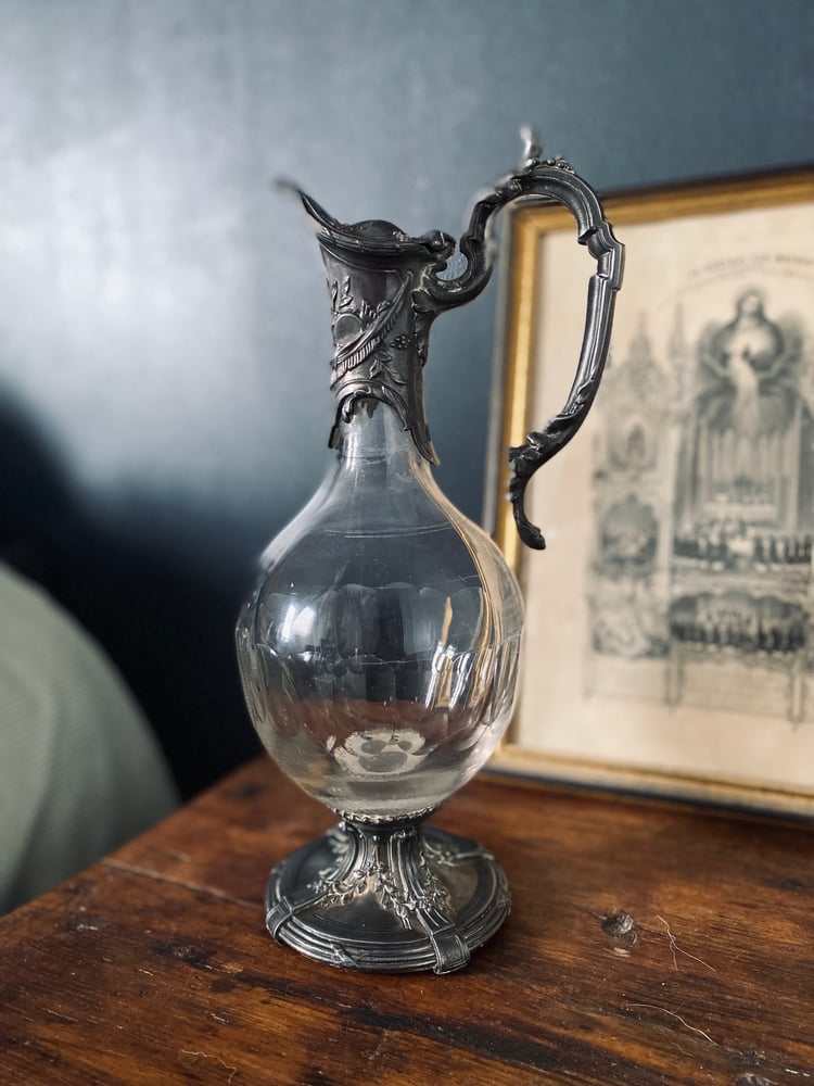 Objet ancien : sublime aiguière en cristal et étain massif, pièce typique du XIXème siècle. On apprécie particulièrement ses détails somptueux au niveau du pied, du bec et de la anse. Elle mesure 32cm de haut et 11cm de largeur. L'intérieur de son bec est oxydé mais cela ne se voit pas lorsqu'elle est fermée. Le cristal est intact, aucun éclat. L'étain est en parfait état. Une pièce magnifique remplie d'histoire !