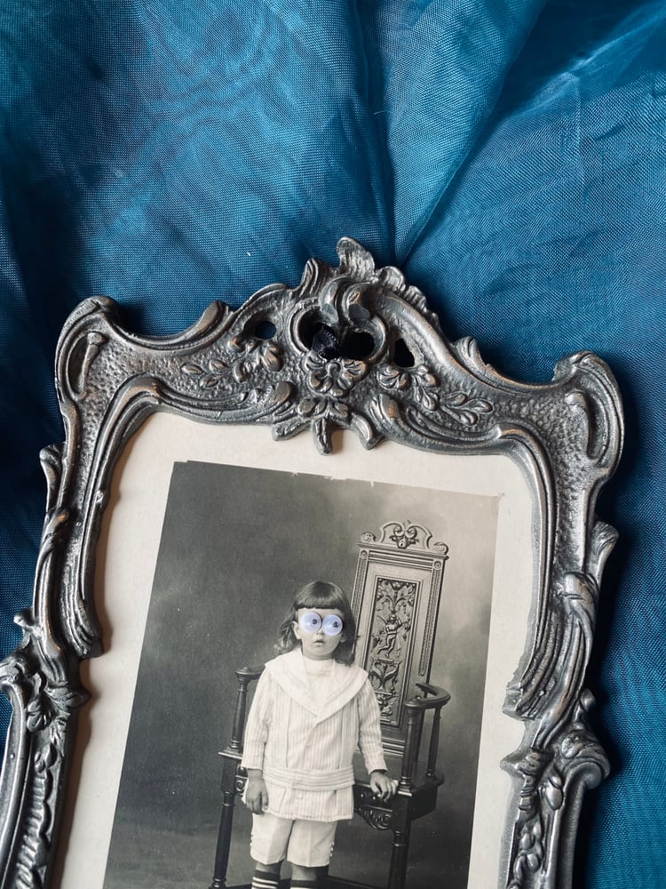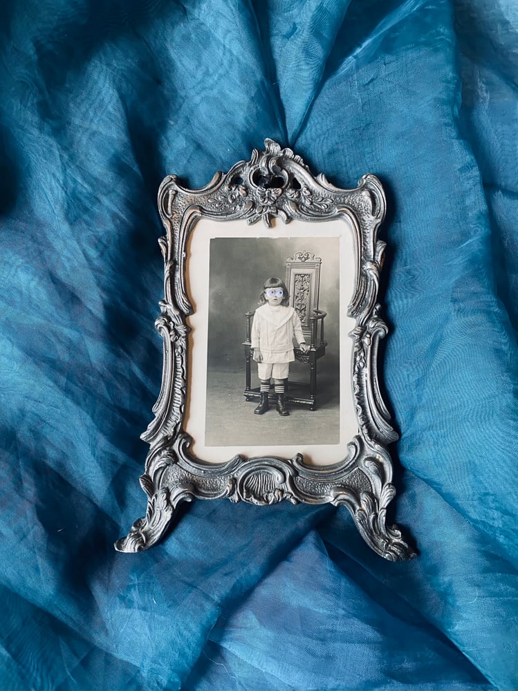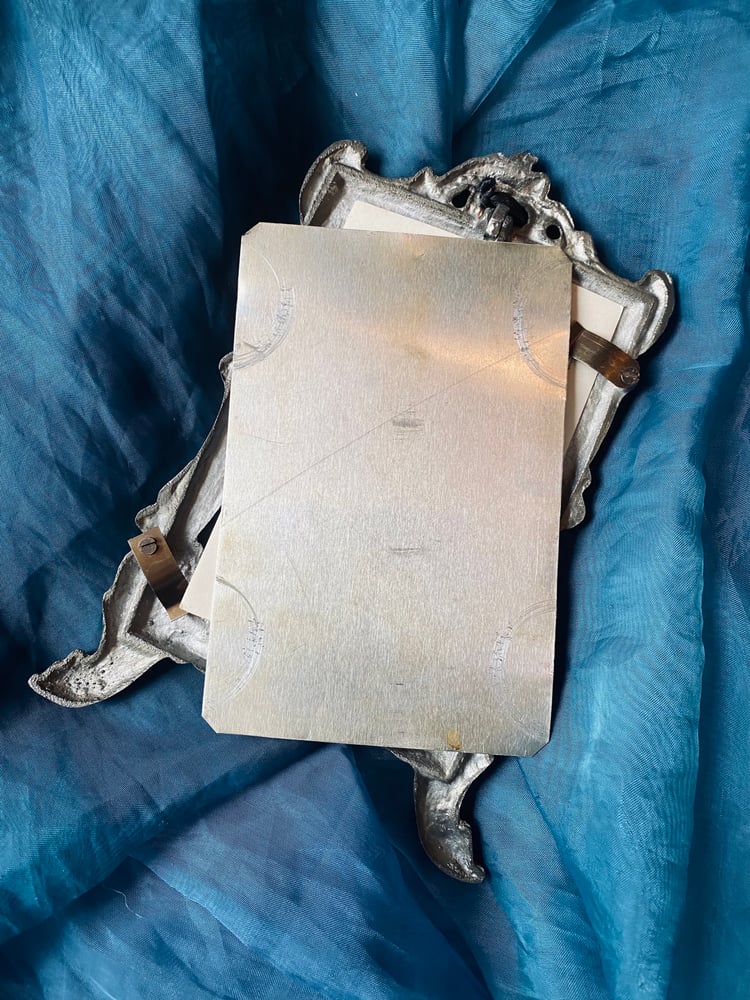 Objet ancien : magnifique cadre à accrocher en métal argenté, époque Art Nouveau, verre et fond inclus. Il mesure 22cm de hauteur avec les pieds et 12cm de largeur. Cette pièce est mon véritable coup de coeur !
