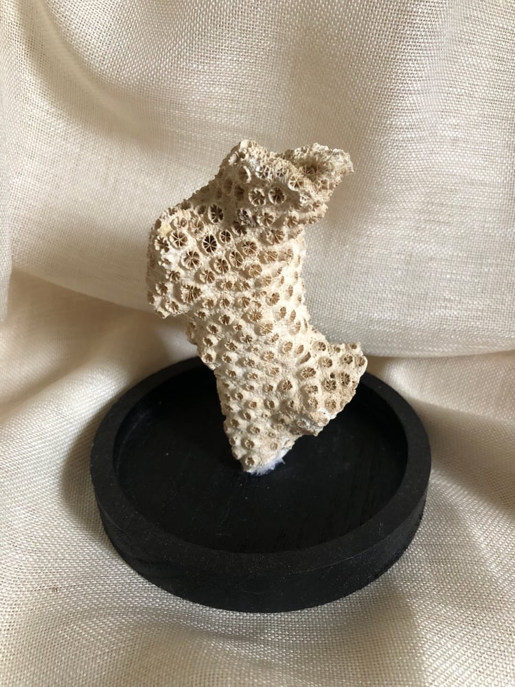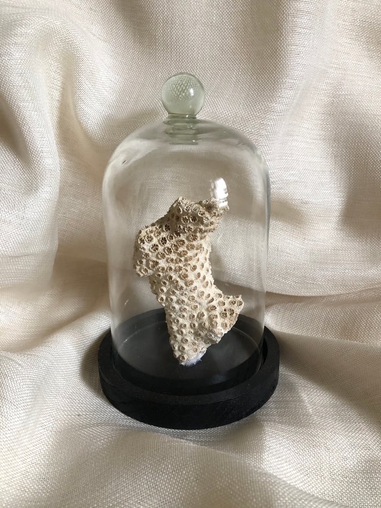 Création unique : véritable morceau de corail "cerveau" blanc, sous cloche. Socle en bois peint, cloche en verre. Très belle pièce pour un cabinet de curiosités !