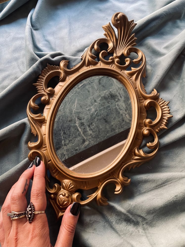 Objet ancien : miroir baroque en résine, milieu XXème siècle. Ses dimensions sont de 34cm de longueur et 23cm de largeur. Attache au dos pour pouvoir l'accrocher. Très bon état.
