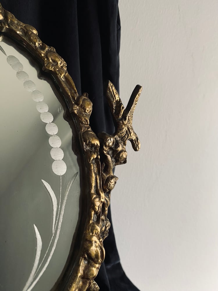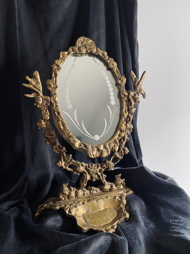 Objet ancien : miroir à poser dit miroir psyché en bronze, le miroir est gravé d'ornements, il comporte une petite coupelle qui sert de baguier, il mesure 34cm en hauteur et 22cm en largeur. Très belle pièce !