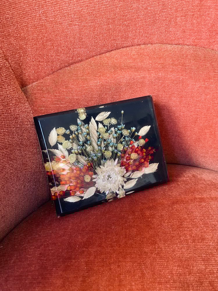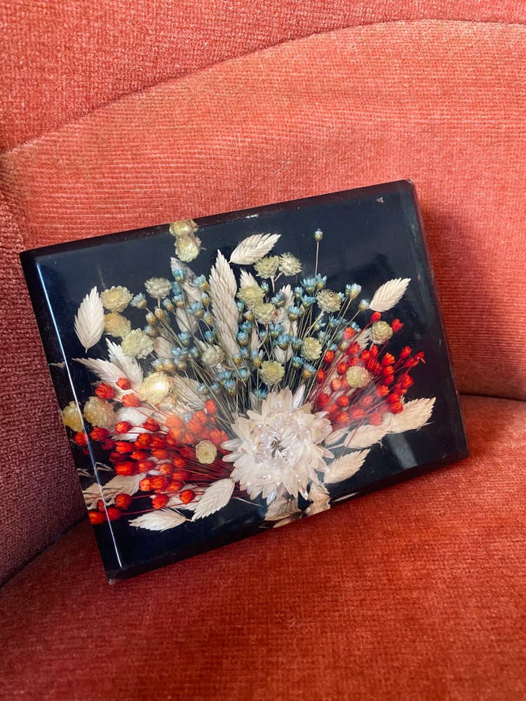 Objet ancien : presse papier en résine avec inclusion de fleurs, années 60/70, 15cm de longueur, 12cm de largeur, le dos présente quelques rayures mais sinon très belle pièce !