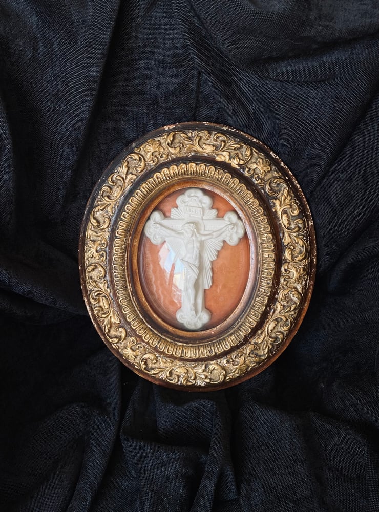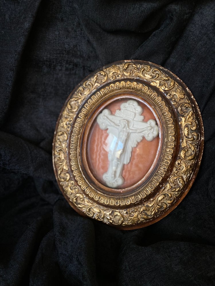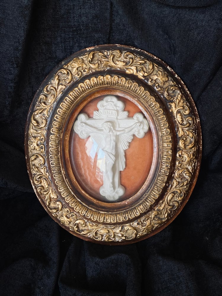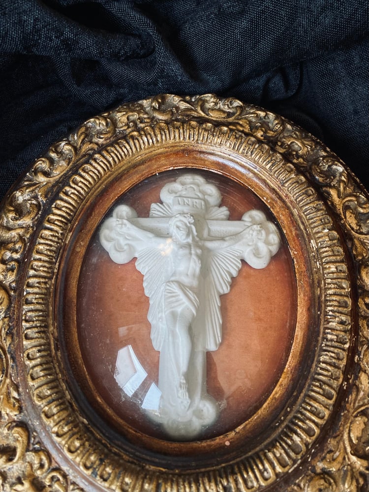 Objet ancien : gros coup de coeur pour ce magnifique reliquaire du XIXème siècle en stuc, à l'intérieur un christ également en stuc, fond de couleur cuivre, verre bombé, dimensions 29cm de longueur, 25cm de largeur. Une pièce rare et en très bon état pour son âge !